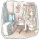 さやしくじ 衣類のかけてある部屋の座椅子に座ってテレビを見ながら靴下をはいている女性のイラスト AUFKLEBER