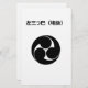 【ひだりみつともえ】巴紋/巴の左右は渦の巻き方ではなく、作図上から作られた合理的な名称なのでした。こうしたことは、上絵師ならすぐに判ることですが、一度も紋を作図したことのない先生はただ渦の巻く方向にだけ気を取られるのでしょう。しかし、上絵師でも咄嗟に巴の左右に迷うことがあります。そんなとき、上絵師はうまい口伝を思い出します。・・・まず左掌を握って手首を見ます。するとその形が左巴の形になっているのです。右掌を握れば、たちどころに右巴の形が現れるわけです。(泡坂妻夫著"家紋の話" P61)/この図案は、地抜き(摺込み)の仕様です。摺込みというのは・・作図して巴を切り抜いて型紙を作り・・この型紙を生地の上に置き、塗料を刷毛で摺込む、その技法からきた言葉です(泡坂妻夫著"卍の魔力、巴の呪力" P146参考)