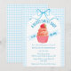 The heart of this baby shower invitation is a darling cupcake crowned with a sweet strawberry, set against a soft watercolor gingham backdrop and finished with a delicate bow.