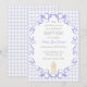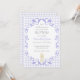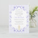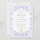 Diese Tauf Einladung zeigt eine zarte Aquarell-Kerze mit einem kleinen Kreuz, umrahmt von eleganten, geschwungenen Verzierungen. Vor einem hellen Aquarell-Gingham-Hintergrund wirkt das Design sanft und vintage.