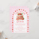 At the center of this baby shower invitation is the sweetest strawberry shortcake, framed by a scalloped border sprinkled with tiny strawberries like little kisses of summer. Set against a soft watercolor gingham backdrop, the whole design feels light, nostalgic, and delightfully fresh.