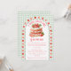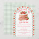 At the center of this baby shower invitation is the sweetest strawberry shortcake, framed by a scalloped border sprinkled with tiny strawberries like little kisses of summer. Set against a soft watercolor gingham backdrop, the whole design feels light, nostalgic, and delightfully fresh.