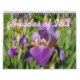 Showy Blüte in den Schatten von Lila, von Blauem, von Gelbem und Rot. Riesige Iris, Felder von Iris, Iris silhouettiert gegen Rhododendren, Efeu und Hosta.