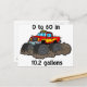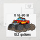 Ein Cartoon eines LKW mit großen Reifen, die den Schmutz aufreißen. Die Wörter 0 bis 60 in 10,2 Gallonen, die sie umgeben. Lasse zumindest versuchen, unsere Gasreserven zu erhalten.