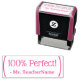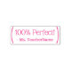 Dieses ermutigende Design der Gummi-Briefmarke zeigt die ermutigende Botschaft "100% Perfect!" und den Namen eines Lehrers oder Lehrers. Es könnte von einem Lehrer, Pädagogen oder Tutor verwendet werden, um zu zeigen, dass der Schüler eine großartige Arbeit geleistet hat.
