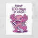 Niedliches Design mit einem axolotl mit einem Rucksack und einem großen Stift mit dem Zitat "Happy 100 days of school". Alles Gute zum 100. Tag der Schule oder des Kindergartens.