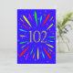 Einladung zum 102. Geburtstag. Fügen Sie einen Namen und Ihre Details hinzu, um eine fantastische Geburtstagsfeier-Einladung zu machen. Eine explosive Party Zeiteinladung! Was für eine wunderbare Art, Party Einladungen zu verschicken. Die Worte "Party Time" in hellen Farben mit einer Explosion von hellen Farben und Sternen.