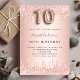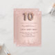 Eine moderne, stilvolle und glamouröse Einladung für die 10. Geburtstagsfeier eines Mädchens. Ein Imitat Rose goldener Hintergrund mit Tropfen, Farbe Tropfen aussehen. Der Name ist mit einer modernen dunklen Rose goldfarbenen Handschrift geschrieben, die als Stilschrift dient. Personalisieren Sie Ihre Party-Daten und fügen Sie sie hinzu. Nummer 10 wird mit einem Schriftart im Ballonstil geschrieben, Skript.
