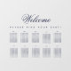 Eine einfache, transparente Sitzkarte mit 10 Tischen, empfohlen für eine marineblaue Hochzeit, aber auch zu anderen Anlässen verwendbar. Es handelt sich um eine Fensterverkleidung, die auf ein Fenster oder eine andere durchsichtige Glas- oder Acryloberfläche gelegt werden kann. Der gesamte Text ist marineblau. Das Wort Willkommen ist in einem eleganten kalligrafischen Skript geschrieben, die Erholung in Kappen. Die Tabellen befinden sich auf 2 Zeilen. Über ihnen und unter dem Wort "Willkommen" steht die Meldung "Bitte finden Sie Ihren Sitzplatz!".