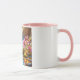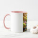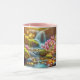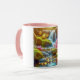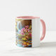 Diese 11 oz Kombi-Tasse hat Farbe auf der Innenseite und am Griff, während der Rest der Tasse weiß ist. Ein Bild von rosa Wildblumen, die neben einem Bergbach blühen, bedeckt die Vorderseite.