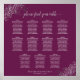 Dieses 11 Tisch Sitzdiagramm ist einfach und elegant mit hellgrauem Text auf magenta oder cassis lila Hintergrund. Das Design ist mit einem kalligraphischen Titel mit zartem Schriftzeichen versehen, der in den Ecken mit dekorativen, fein silbernen Imitaten-Filigree versehen ist. Stilvoll, elegant und raffiniert, um Ihren Gästen zu helfen, ihren Platz an Ihrem Hochzeitsempfang zu finden. Es beinhaltet Tischbelegung für 110 Gäste mit 10 Plätzen pro Tisch.