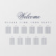 Eine einfache, transparente Sitzkarte mit 11 Tischen, empfohlen für eine marineblaue Hochzeit, aber auch zu anderen Anlässen verwendbar. Es handelt sich um eine Fensterverkleidung, die auf ein Fenster oder eine andere durchsichtige Glas- oder Acryloberfläche gelegt werden kann. Der gesamte Text ist marineblau. Das Wort Willkommen ist in einem eleganten kalligrafischen Skript geschrieben, die Erholung in Kappen. Die Tabellen befinden sich auf 2 Zeilen. Über ihnen und unter dem Wort "Willkommen" steht die Meldung "Bitte finden Sie Ihren Sitzplatz!".