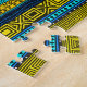 Ein schwarz-weißer Zebra auf einem afrikanischen Druckdesign in Blau-, Gelb- und Schwarz-Tönen.