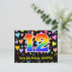 Die Vorderseite dieses aufregenden, liebevollen und lustigen Geburtstags-Thema Postkarte zeigt eine große Zahl "12" mit einem inspirierten Regenbogenspektrum. Es enthält auch die Meldung "Happy 12 th Birthday", und einen benutzerdefinierbaren Empfängernamen. Die Vorderseite hat zusätzlich ein lebendiges und farbenprächtiges Muster liebender Herzformen. Auf dem Rücken befindet sich eine bearbeitbare Geburtstagsgrüßnachricht, oder es kann sein, dass sie gelöscht und leer verlassen wird, wenn eine Nachricht von Hand geschrieben werden soll. Eine personalisierte Geburtstagskarte wie diese könnte eine lustige Art sein, eine Nachricht zu senden, die jemandes zwölften Geburtstag feiert. Postkarten wie diese können auch benutzt werden, um die Gäste zu einer Geburtstagsparty für jemanden einzuladen, der 12 Jahre alt wird. [~Z0000448]