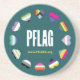 Ein Sandstein-Untersetzer mit dem PFLAG-Logo und 12 Herzen mit Farbtönen verschiedener LGBTQ+-Stolperflaggen