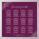 Dieses 12-Tisch Hochzeitsstühle Diagramm ist sowohl einfach als auch elegant. Es beinhaltet Tischbelegung für 120 Gäste mit 10 Plätzen pro Tisch. Das Design enthält grauen Text auf einem magenta oder cassis lila Hintergrund mit einem laky Skript Kalligraphietitel. Die Ecken sind mit einem kühnen Imitat-Folie silberne Filigree mit Gardinen und Wirbel dekoriert. Stilvoll, elegant und raffiniert, um Ihren Gästen zu helfen, ihren Platz am Empfang zu finden.