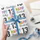 Roll of brillante Packpapier aus einer einfachen Typografie "Happy Birthday" mit Blockbuchstaben für HAPPY und ein lässiges Drehbuch für Geburtstag. Die Nummer 13 ist mit bunten Polka dot confetti dekoriert. Ein Verpackungspapier, das Sie für jedes Papier verwenden können.