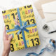 Roll aus farbenfrohen Verpackungspapieren mit gelbem Hintergrund einer einfachen Typografie "Happy Birthday" mit Blockbriefen für HAPPY und einem lässigen Drehbuch für Geburtstag. Die Nummer 13 ist mit bunten Polka dot confetti dekoriert. Ein Verpackungspapier, das Sie für jedes Papier verwenden können.