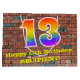 Dieses lebendige und farbenfrohe Geschenktütendesign, das von urbaner Kunst und Graffiti inspiriert wird, weist eine große Zahl "13" auf, die ein inspiriertes Regenbogenspektrum aufweist. Es enthält auch die Meldung "Happy 13 th Birthday", und einen bearbeitbaren Namen. Der Hintergrund weist ein Ziegelwandmuster auf. Ein lustiger Geburtstagsgeschenksack wie dieser kann verwendet werden, wenn ein Geschenk oder Geschenk zur Feier des dreizehnten Geburtstages von jemandem. [~Z0000522]