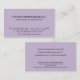 Diese elegante Visitenkarte zeigt Ihre Informationen in einer sauberen und beruflichen Art und Weise mit einem modernen schwarzen Schriftart auf einem hellen violetten Hintergrund. Dieses Design ist für alle Zwecke geeignet. Visitenkarten sind ein großartiges Marketing für Unternehmen und Kleinunternehmer, um ihre Dienstleistungen oder Produkte in vielen Bereichen wie Bildung, Beratung, Finanzen, Versicherung, reales Anwesen, Gesundheit, Schönheit, Fitness, Lifestyle, Auto, IT, Computer und vieles mehr zu fördern. Auf dieser modernen und eleganten Visitenkarte werden Name und Geschäftsinformationslinien durch einen subtilen Schatten verstärkt. Sie können Ihre eigene Hintergrund- oder Schriftart-Farbe wählen und auch die Schattenfarbe ändern, indem Sie das Design mit Zazzles-Designtools anpassen. Passen Sie den Text auf der Rückseite der Karte an, um Kunden und Geschäftspartner über Ihren Service oder Ihre Produkte zu informieren oder Textfelder zu löschen, die Sie nicht benötigen. Wenn diese Visitenkarte für den privaten Gebrauch bestimmt ist, können Sie nicht gewollt werden, zu viele Informationen zu verteilen, um Ihre Sicherheit zu schützen. In diesem Fall können Sie die Vorderseite der Karte benutzen, um Ihren Namen und Ihre E-Mail-Informationen darauf auszudrucken und Ihre Telefonnummer auf die Rückseite der Karte zu schreiben, wenn Sie sie ausgeben. Zeigen Sie Ihren Professionalismus gegenüber Kunden und Freunden und machen Sie einen bleibenden Eindruck, indem Sie sich für Zazzles berufliche Visitenkartendrucke entscheiden.