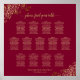 Dieses elegante Hochzeitssitzdiagramm zeichnet sich durch einen bordeauxroten, maroonfarbenen oder weinroten Hintergrund aus, sowie durch goldene Verzierungen aus lackierten Imitaten, wie z.B. Filigree oder Frills. Das Design ist ausgeklügelt, aber einfach, und verfügt über einen exquisiten Script-Kalligraphie-Titel. Das Diagramm fasst bis zu 130 Namen, verteilt auf 13 Tische mit 10 Plätzen pro Tisch. Zusätzlich gibt es unten Platz für die Namen der Braut und des Bräutigams, zusammen mit dem Hochzeitstag. Es ist eine fantastische Möglichkeit, Ihrem Hochzeitsempfang eine Touch von Stil und Eleganz hinzuzufügen und gleichzeitig Ihren Gästen bei der Sitzplatzsuche behilflich zu sein.