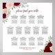Dieses schöne 13-Tisch-Hochzeitsdiagramm zeichnet sich durch ein rustikales bohisches Design aus. Handgemalte Aquarellfarben in Bordeaux-, Rot- und Rosatönen, umgeben von Eukalyptus-Blätter und Gartengrün. Das traditionelle Arrangement bietet Platz für 130 Namen mit 10 Sitzplätzen pro Tisch. Der Titel ist in eleganter Schrift-Kalligraphie geschrieben, und es gibt Platz für die Namen des Paares und Hochzeitstag unten. Auf diese Weise können Sie Ihrem Empfang Schönheit und Stil verleihen und gleichzeitig Ihren Gästen den Zugang zu den Sitzplätzen erleichtern.