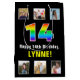 Dieses tolle Geschenksack-Design mit einer großen Zahl "14", die ein lebendiges, buntes Regenbogenspektrum inspiriert Farbverlaufsmuster, die Nachricht "Happy 14. Geburtstag" und einen anpassbaren Empfängernamen aufweisen. Die Fotos über und unter der Nachricht können personalisiert sein, vielleicht mit Fotos des Empfängers, der Familie und Freunden des Empfängers und/oder dem/den Absender(en) des Geschenks. Ein solcher Geschenksack kann verwendet werden, wenn Geschenke oder Geschenke umhüllt werden, die jemandem anlässlich seines vierzehnten Geburtstages gegeben werden. (Fotografie © Storytree Studios, Stanford, CA.) [~Z000669]