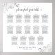 Diese schöne Hochzeitskarte beinhaltet Tischbelegungen für 140 Gäste an 14 Tischen. Das schlichte und dennoch elegante Design ist mit dunkelgrauem Text auf weißem Hintergrund mit einem laky-Script-Kalligraphietitel ausgestattet. Die Ecken sind mit einem albernen Filigree aus Imitat mit Gardinen und Wirbel geschmückt. Stilvoll, elegant und raffiniert, um Ihren Gästen zu helfen, ihren Platz am Empfang zu finden.