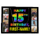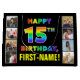 Dieses sehenswerte und lustige Geburtstagsgeschenk-Geschenktütendesign beinhaltet die Nachricht "HAPPY 15TH BIRTHDAY" mit einem farbenfrohen Regenbogenspektrum, inspiriert Farbverlaufsmuster und einem bearbeitbaren Empfängernamen. Auf der Vorderseite sind einige Foto, die links und rechts von der Regenbogen-gemusterten Botschaft sind, die personalisiert sein können, vielleicht mit Fotos des Empfängers, der Familie und Freunden des Empfängers und/oder dem/den Absender(en) des Geschenks. Eine lustige Geburtstagsgeschenktüte wie diese könnte eine lustige Art sein, ein Geschenk zum Feiern des fünfzehnten Geburtstags eines Menschen zu verpacken. (Fotografie © Storytree Studios, Stanford, CA.) [~Z000668]