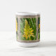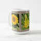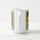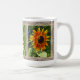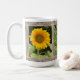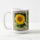 Beginnen Sie Ihren Tag mit einer Kaffee-Tasse, die eine inspirierende Botschaft und Fotos von fröhlichen Sonnenblumen und einem roten, heißen Poker mit einem Rahmen aus den einzigartigen Mustern der Baumrinde enthält.