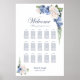 Helfen Sie Ihren Gästen, ihren Tisch mit dieser blauen und weißen Rosenblütenkarte zu finden. Es ist für eine Hochzeit mit 15 Tischen und 150 Personen geeignet.