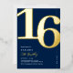 Echte Folie Navy Blau und Gold 16. Geburtstagsfeier Einladungen mit der Nummer '16" in einem großen fetten Serif-Schriftart, und eine moderne Einladungs-Vorlage, die leicht zu personalisieren ist.
