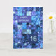 16. Geburtstagkarte. Herzlich willkommen zum Geburtstag mit einer eleganten Karte. Blaue und lila Quadrate bilden eine coole männliche Geburtstagskarte. Wünschen Sie einen guten Geburtstag und lächeln Sie gleichzeitig.
