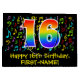Dieses lustige, farbenfrohe und lebendige Geburtstagsgeschenk-Design verfügt über eine große Zahl "16" mit einem inspirierten Regenbogenspektrum-Muster, zusammen mit der Meldung "Happy 16. Geburtstag", und einen individuelle Name. Ein Teil des Hintergrunds hat farbenfrohe Musiknote und Symbolmuster. Eine lustige Geschenktasche wie diese kann verwendet werden, wenn Geschenke umhüllt werden, die einem Musiker, einem Sänger, einem Musikkomponisten oder jemand anderem in der Feier ihres 16. Geburtstages gegeben werden. [~Z0000425]