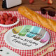 Spaß und hübsche 16. Geburtstag-Geburtstags-PartyAusrüstungsbeschreibungen eine Reihe der hübschen Makronen in einem Regenbogen von Farben wie Gelbes, Grünes, Blaues, rosa und Braunes. Es gibt Streifen der gleichen Farbe über jeder Makrone mit einem hellblauen Hintergrund. Unter den Makronen ist ein fester weißer Bereich. Auf jede Makrone ist ein Buchstabe, der Bonbon in 16. Geburtstag formuliert. Es gibt kundengerechten Text im schwarzen Schriftart, in dem Sie den Geburtstagsmädchennamen addieren können. Unterhalb der Reihe der yummy Makronen ist Text im schwarzen Skript-Schriftart, der 16. Geburtstag-Feier sagt! Dieser Spaßentwurf koordiniert tadellos mit unserem 16. Geburtstag-Geburtstags-Regenbogen der Makronen-Party Einladungen!