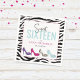 Dieses Design lädt Mädchen zum Geburtstag ein, mit einem Girly, Modeschuhen, die für sechzehn süße 16 gut geeignet sind, mit klassischem, funkelndem Schmuck, extravaganter Eleganz, moderner minimalistischer, feminininer Chic-Mädchen, mit klassischer extravaganter Drehkalligraphie, einer stilvollen coolen Typografie, mit tierischem Tiger zebra schwarz, Frauenkleder hohen Ferse.