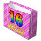 Dieses lustige und fröhliche 16. Geburtstag Thema Geschenktasche Design zeigt eine große Zahl "16" mit einem Regenbogenspektrum inspiriert Farbverlauf. Es enthält auch die Meldung "Happy 16. Geburtstag", und ein individuelle Name. Der Hintergrund ist mit einem dunkelrosa und hellrosa Streifen mit liebevollen rosa Herzformen gestaltet. Eine Geschenktasche wie diese kann verwendet werden, wenn Geschenke oder Geschenke umhüllt werden, die zu Ehren des sechzehnten Geburtstages von jemandem gegeben werden. [~Z0000414]