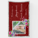 16 . Geburtstag Willkommen Banner in hellrot mit silbernen Glitzer-Rahmen, glitzernden Sternen und Aquarellfarben-Blume. Es gibt einen weißen Rahmen für Ihr Foto. Personalisieren Sie mit dem Namen und dem Datum Ihres Geburtstagsmädchens, perfekt für Bat Mitzvah oder Quinceanera.