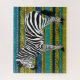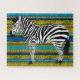 Schwarz-Weiß-Zebra-Illustration auf einem Hintergrund afrikanischer Muster in Blau-, Gelb- und Schwarztönen.