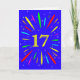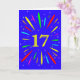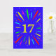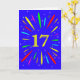 Eine explosive 17. Geburtstagskarte! Was für eine wunderbare Art, Geburtstagsgrüße zu schicken. Die Nummer 17 in hellgelb mit einer Explosion von hellen Farben und Sternen.