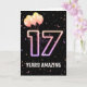 Party Ballons und Konfetti auf schwarzem Hintergrund mit dem Neon Nummer 17 zum 17. Geburtstag.
