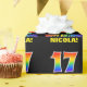 Dieses farbenfrohe, lustige und fröhliche Geburtstagsblatt-Design zeigt eine große Zahl "17" und die Meldung "HAPPY BIRTHDAY", beide mit einem inspirierten Regenbogenspektrum-Farbverlauf, zusammen mit einem kühnen gelben benutzerdefinierten Empfängernamen. Der Hintergrund ist schwarz. So ein lustiges Geburtstagsthema könnte dazu verwendet werden, ein Geschenk oder Geschenk zu verpacken, das zur Feier des 17. Geburtstages von jemandem gegeben wird. [~Z0000475]