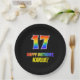 Dieses lustige, fröhliche und farbenfrohe Geburtstags-Thema Papier-Platte-Design zeigt eine große Zahl "17" und die Nachricht "GLÜCKLICH BIRTHDAY", beide mit einem Regenbogenspektrum inspirierte Muster-Färbung, zusammen mit einem kühnen gelben editierbaren Namen. Es hat einen schwarzen Hintergrund. Spaß, maßgeschneiderte Teller wie diese könnten bei einem Party genutzt werden, um jemandes siebzehnten Geburtstag zu feiern. [~Z0000488]
