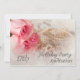 Ein schönes zartes Bild einer Rose in sanften Rosatönen, im Hintergrund eine Perlenkette. Die ganze Wirkung wird durch die zarte Feder gemildert. Eine schöne Geburtstagsfeier. Ändern Sie den Rücken in Ihre eigenen Party-Details