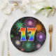Dieses fröhliche, farbenfrohe und lustige Papier-Plattendesign zeichnet sich durch eine große Zahl "17" aus, die ein inspiriertes Muster des Regenbogenspektrums enthält. Es verfügt auch über ein aufregendes und lebendiges Berstungsfeuerwerk Muster. Es hat einen schwarzen Hintergrund. Teller wie diese können bei einer Feier verwendet werden, um jemandes 17. Geburtstag, 17. Jahrestag oder ein anderes siebzehntes Ereignis zu ehren. [~Z0000490]