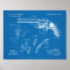 1885 Vintager Revolver von Wesson. US-Patentdesign zeichnend. Alle unsere US-Patentzeichnungen wurden restauriert und verbessert, sodass sie auf kleinen bis großen Drucke für gerahmte Kunst gut aussehen. Weitere Patentdrucke finden Sie in unserem Abschnitt "US-Patentdrucke". Hintergrund für blaues technisches Designpapier mit weißer Linie gezeichnet.