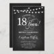 Einladung zum 18. Geburtstag. Einfaches Schwarz-Weiß-Design mit Chalkboard-Muster und Feen-Saitenleuchten. Enthält Skript-Schriftart. Bis 18 Jahre! Kann in jedem Alter personalisiert werden! Nachricht, wenn Sie weitere Anpassungen benötigen.