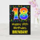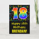 Die Vorderseite dieses lustigen, lebendigen und farbenfrohen Geburtstagskarten-Designs zeigt eine große Zahl "18" mit einem inspirierten Regenbogenspektrum. Es enthält auch die Meldung "Happy 18th Birthday", und einen bearbeitbaren Empfängernamen. Die Vorderseite hat auch einen bunten Musiknoten und Symbolmuster. Im Inneren befindet sich eine personalisierte Geburtstagsgrüßbotschaft, oder man könnte sie löschen und leer verlassen werden, wenn eine Nachricht von Hand geschrieben werden soll. Eine personalisierte Geburtstagskarte wie diese ist vielleicht eine lustige Art, jemandes achtzehnten Geburtstag zu feiern. [~Z0000420]