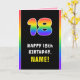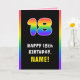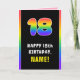 Dieses fröhliche und lebendige Geburtstagskarten-Design zeigt eine große Zahl "18" mit einem lebendigen Regenbogenspektrum, inspiriert Farbverlaufsmuster, zusammen mit der Meldung "HAPPY 18. BIRTHDAY" und einem anpassbaren Empfängernamen. Im Inneren befindet sich eine bearbeitbare Geburtstags-Grußnachricht, oder man könnte sie löschen und leer verlassen werden, wenn eine Nachricht von Hand geschrieben werden soll. Eine lustige, bearbeitbare Geburtstagskarte wie diese könnte eine lustige Art sein, Geburtstagsgrüße an jemanden zu senden, der seinen achtzehnten Geburtstag feiert. [~Z0000636]