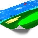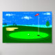 Poster mit einer digitalen Abbildung des 18. Lochs auf einem Golfplatz mit bewölktem blauem Himmel, See, Bäume, Sandfalle und dem Golfball, der auf dem Grün sitzt, Zentimeter von der Tasse entfernt, in die gewartet wird.